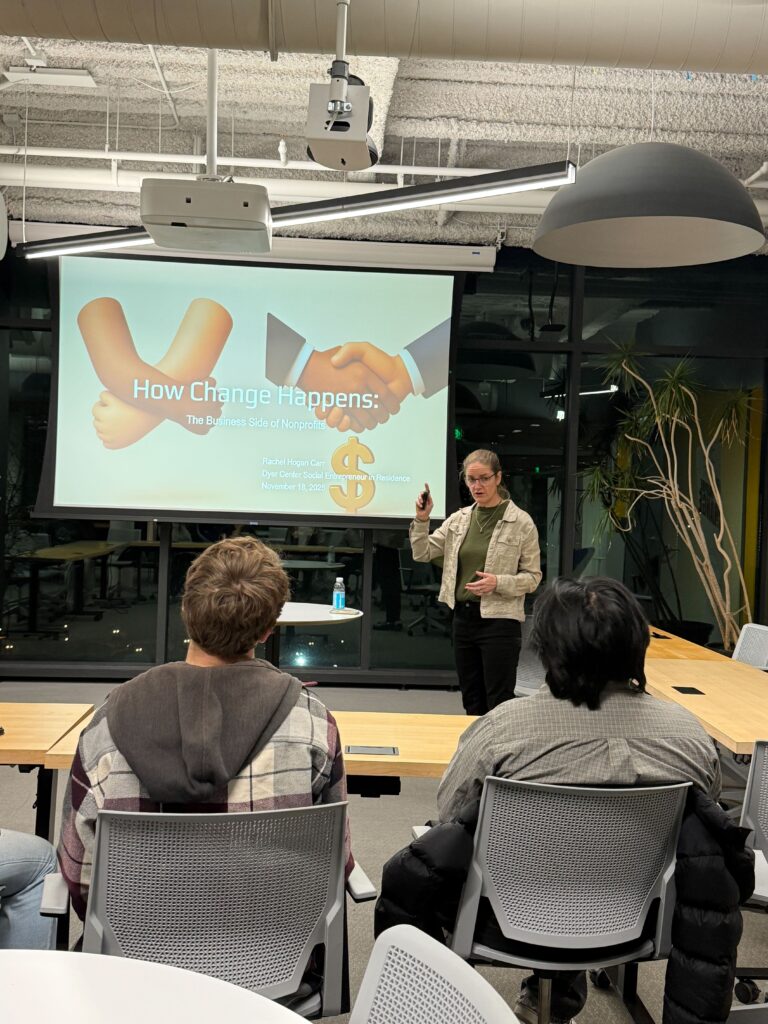 On November 18, the Dyer Center was thrilled to host our Social Entrepreneur in Residence, Rachel Hogan Carr, for an insightful presentation titled "How Change Happens: The Business Side of Non-Profits."
